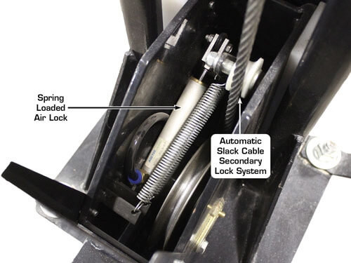 Features a redundant safety system designed for long-term storage. A spring-loaded, multi-position locking mechanism automatically engages at every ladder rung as the lift rises. Crucially, it includes a secondary Slack-Cable Safety System that acts as an emergency backup, instantly locking the runways in place if a cable were ever to go slack or fail. This dual-redundant design provides complete peace of mind.