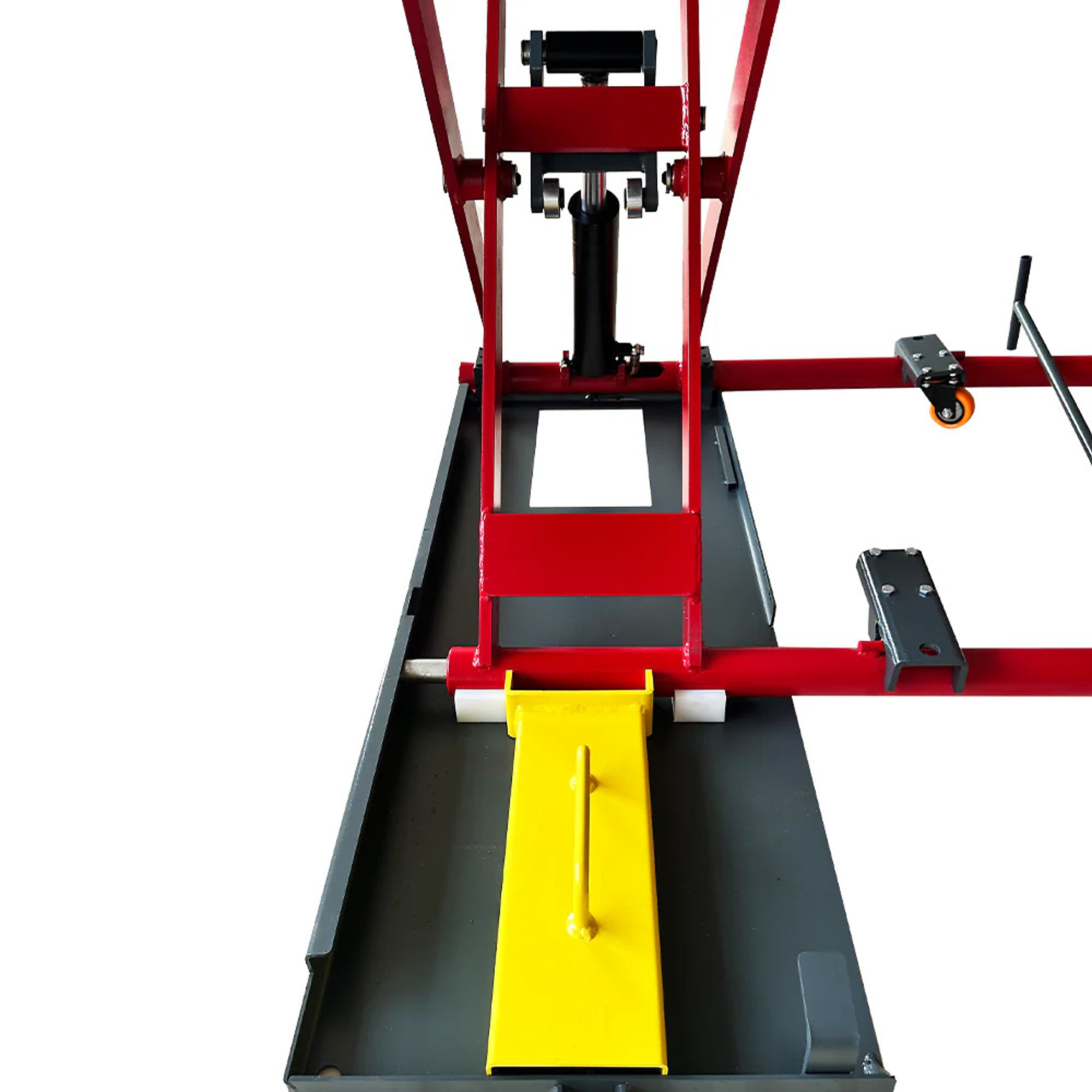 Full hydraulic system inspection. Replace hydraulic fluid if discolored. Check all pivot pins for wear. Inspect platform surface for damage or warping.