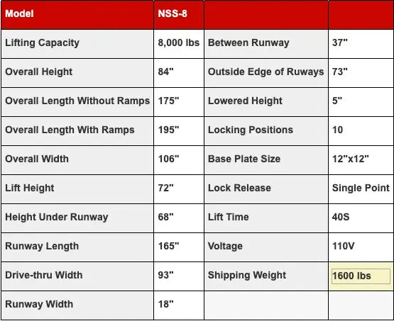 The Triumph NSS-8 is a 8,000-lb capacity 4-post lift designed for home garage storage and light maintenance. 4-post lifts are the easiest to install and safest to operate, making them ideal for enthusiasts who want to maximize their garage space or store a second vehicle.
